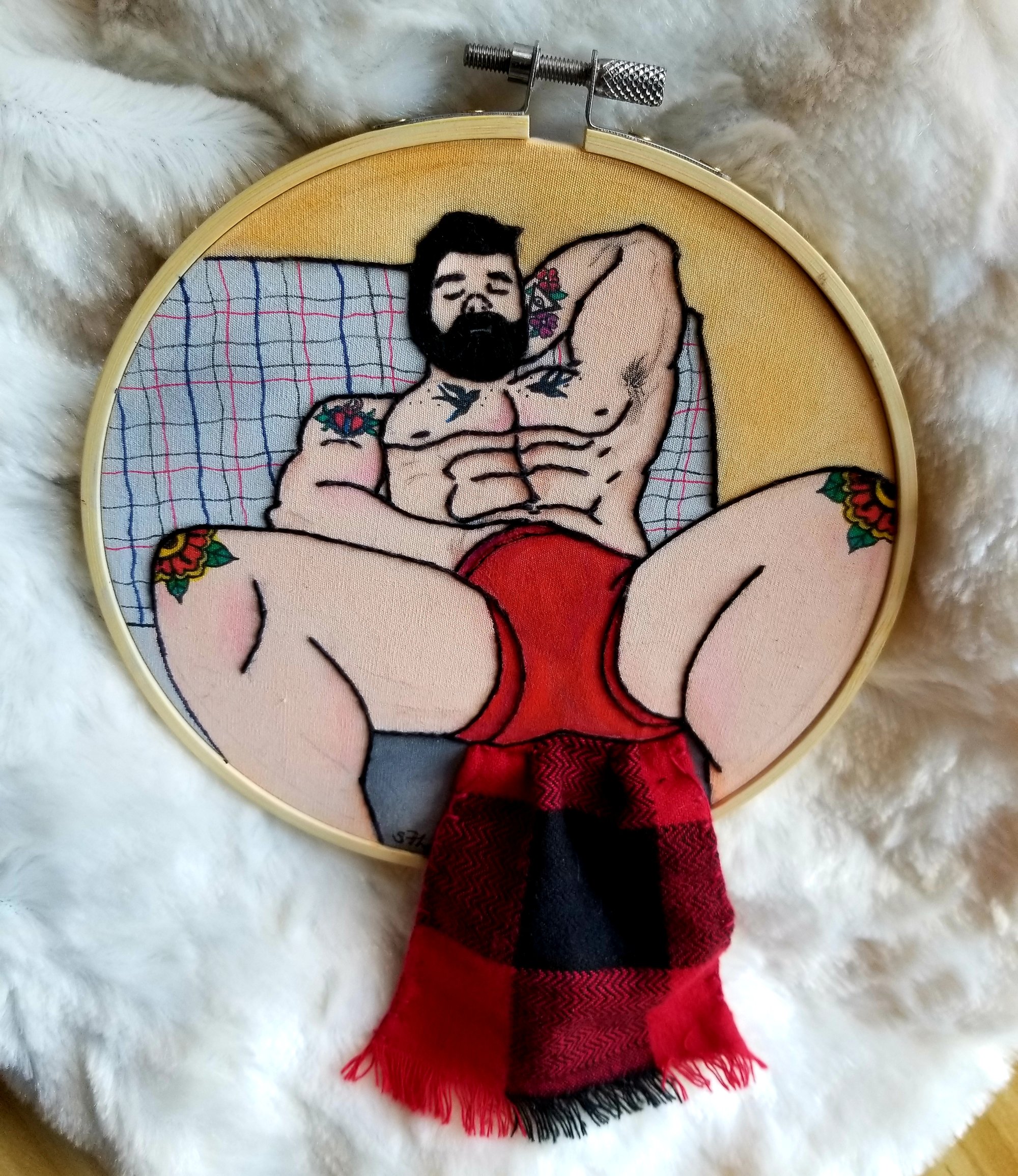 "Mountain Man Self Care" 3-D erotic embroidery art.