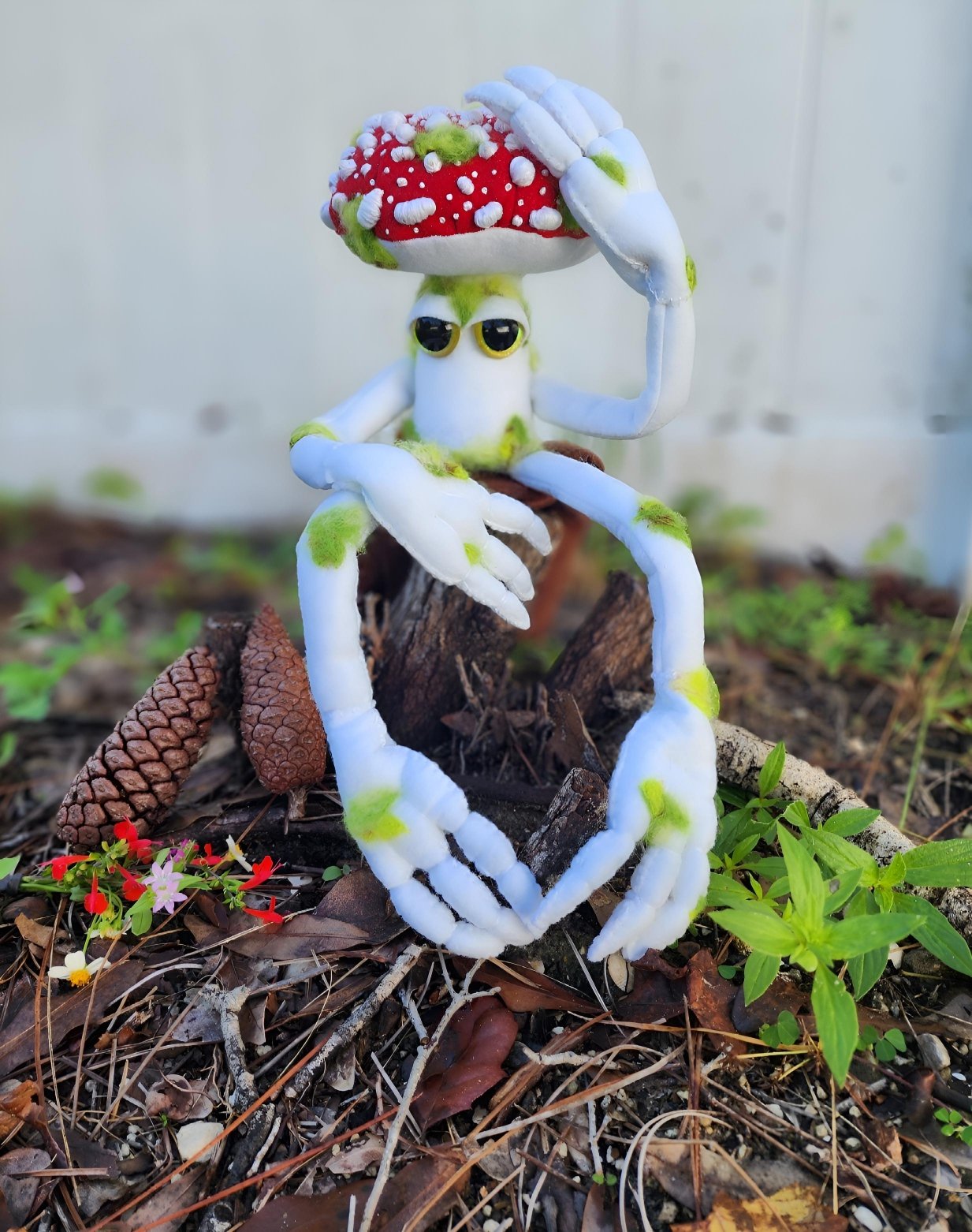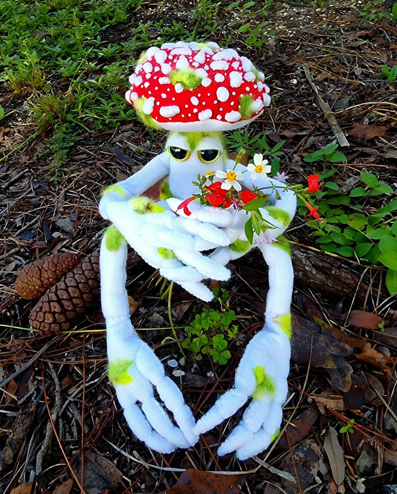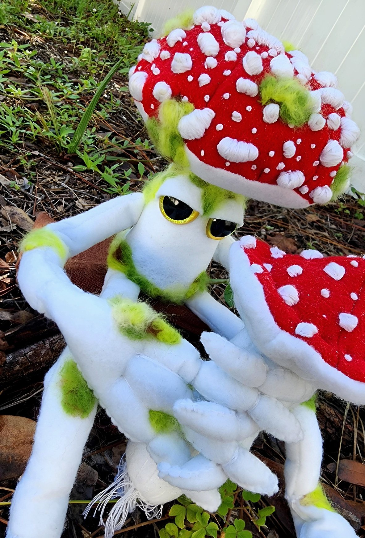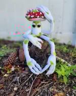 Murphy is a one of a kind heirloom art doll. He has tons of hand-embroidered spots on his cap, along with needle-felted "moss" all over his head and body. Murphy has a weighted bottom and wire armature inside his arms and legs, making him posable! He also has large, sparkly yellow glass eyes. Murphy measures approximately 17 inches in length.